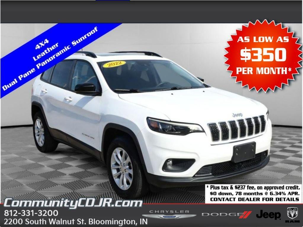 For sale: 2022 Jeep Cherokee Latitude Lux - a versatile, well-equipped SUV with just 34,606 miles, located in Bloomington, IN. Powered by a smooth and reliable V6 3.2L gasoline engine paired with 4WD, this Jeep Cherokee delivers confident traction and composed performance for Indiana roads and weekend getaways. This Latitude Lux trim combines comfort and convenience: leather seats, heated steering wheel, and remote start make every drive enjoyable year-round. Safety features include forward collision warning and rear parking sensors to help keep you and your passengers protected in busy parking lots and on high-traffic streets. The interior offers a refined cabin layout and supportive seating for longer trips, while the 4WD system adds capability for light off-road use and inclement weather. At this location in Bloomington, IN, this 2022 Jeep Cherokee Latitude Lux is priced to move - offering the best price in the area for comparable models. Whether you need a dependable commuter, a family-ready crossover, or a comfortable weekend adventurer, this Jeep Cherokee checks the boxes. Schedule a test drive today to experience the smooth V6 power, comfortable leather interior, and added peace of mind from advanced safety features. Contact us for vehicle history, financing options, and to confirm availability.